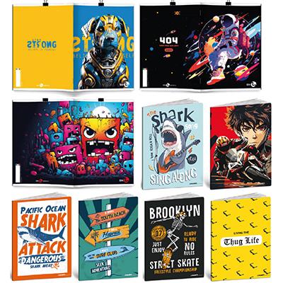 Maxi quaderni con risguardo, disponibili in due diverse grammature e fogliazioni, copertine fantasie assortite.
