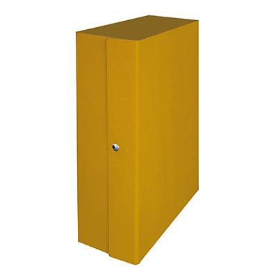 Scatola portaprogetti in cartone pressato goffrato, montaggio e chiusura con bottoni a pressione, corredata di tasca trasparente adesiva ed inserto in cartoncino prestampato per la personalizzazione, fornita smontata per il minimo ingombro, disponibile in 4 brillanti colorazioni.