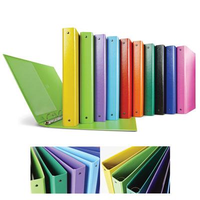 Raccoglitore realizzato in cartone interamente rivestito in PPL con meccanismo a 4 anelli e tasca interna.