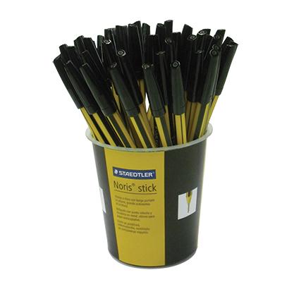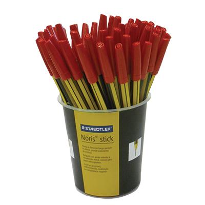 Noris® stick, espositore con 50 penne a sfera punta M = media, disponibile in 4 colori: rosso (02); blu (03); verde (05); nero (09). Grande autonomia di scrittura grazie all'elevato contenuto di inchiostro iniettato direttamente nel fusto della penna. Lungo puntale in ottone utile per la scrittura in spazi ridotti o con l'uso di righelli e mascherine. Cappuccio e fondello nel colore di scrittura. Cappuccio anti soffocamento conforme a ISO 11540. Articolo conforme a ISO 12757-1.