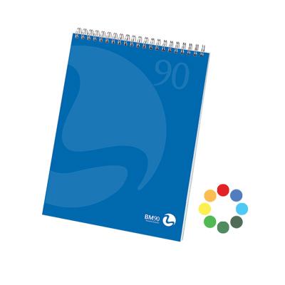 Blocco nel formato A4 spiralato nel lato corto con copertina pesante da gr.300, plastificazione opaca con verniciatura serigrafica lucida, carta interna in pura cellulosa da gr.90, fogli 50. Assortimento in 8 colori. Rigatura 1rigo.