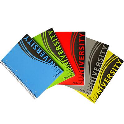 Blocco con spirale sul lato lungo, 288 pagine con fori microperforato sul lato lungo. Carta con elevato punto di bianco da 70 gr./mq., ultima di copertina in cartoncino. Disponibile in tre rigature e cinque colori di copertina assortiti.