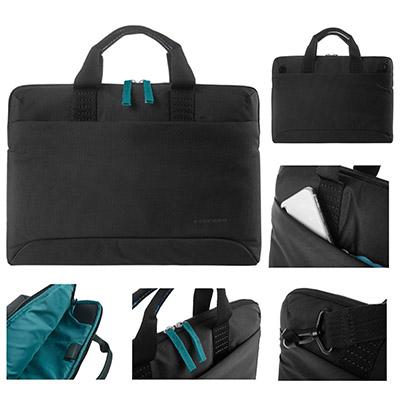 Borsa super slim in materiale tecnico con dettagli in contrasto colore per laptop fino a 15.6. Vano inte rno unico con orecchie in neoprene per bloccare il device. Il lato anteriore dotato di una ampia tasca esterna. Tracolla removibile e manici doppi in nastro.