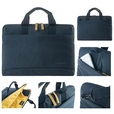 Borsa super slim in materiale tecnico con dettagli in contrasto colore per laptop fino a 15.6. Vano inte rno unico con orecchie in neoprene per bloccare il device. Il lato anteriore dotato di una ampia tasca esterna. Tracolla removibile e manici doppi in nastro.