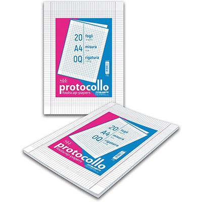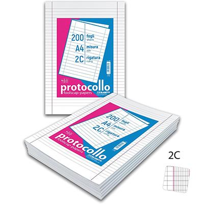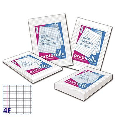 Fogli protocollo in carta prodotta con cellulosa di prima qualit dist ribuita in varie rigature. I protocolli vengono forniti in formato chiuso A4 da gr. 60. Confezione da 200 fogli. La praticita' di una confezi one di protocollo unita alla qualita' della carta.