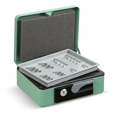 Cassette portavalori realizzate internamente in acciaio pressofuso senza saldature. La verniciatura a polvere ne garantisce durata e inalterabilità. Innovativo e brevettato meccanismo di apertura automatica. Serratura a cilindro con due chiavi. Vassoio interno portamonete e spugna fermamonete. Dimensioni mm. 197x154x80. Colore blu.