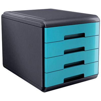 Cassettiera a 4 cassetti, formato utile cm.25x33 altezza cm.4,5,a scorrimento silenziato con blocco di fine corsa e foro sulla base per una più comoda presa dei documenti.Scocca in polisitrolo,è affiancabile e sovrapponibile grazie alle corsie integrate.