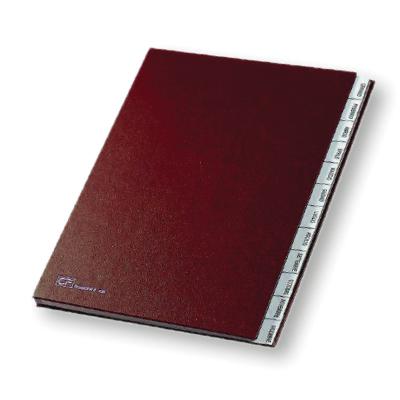 Classificatore mensile articolato su una scala con copertina rivestita in similpelle, dorso rinforzato in carta telata e lettere applicate in plastica serigrafata. Formato utile 240x340 mm.