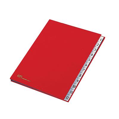 Classificatore numerico 1-12 articolato su una scala con copertina rivestita in similpelle, dorso rinforzato in carta telata e lettere applicate in plastica serigrafata. Formato utile 240x340 mm.