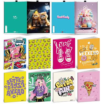 Maxi quaderni con risguardo, disponibili in due diverse grammature e fogliazioni, copertine fantasie assortite.