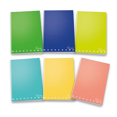 Maxiquaderno Monocromo Green in formato A4 con rigatura 4M, realizzato in carta riciclata da 80 grammi.