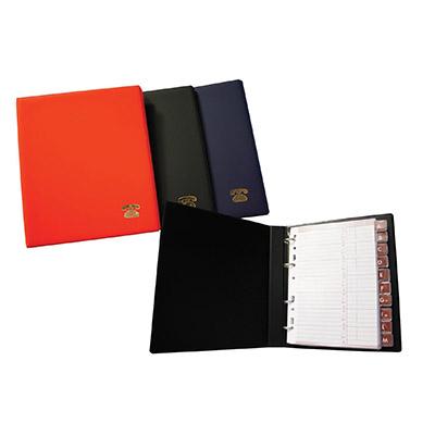 Rubrica telefonica a 4 anelli da mm. 20, struttura in robusto cartone da mm. 2 rivestito in PVC effetto seta fornita completa di rubrica alfabetica a 20 tasti.