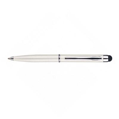 Penna a sfera della lunghezza di cm.10 con meccanismo a rotazione per l'uscita della punta, utilizza mini refill, interamente in metallo con gommino nella parte superiore per l'utilizzo sui touch screen di tablet o smartphone.