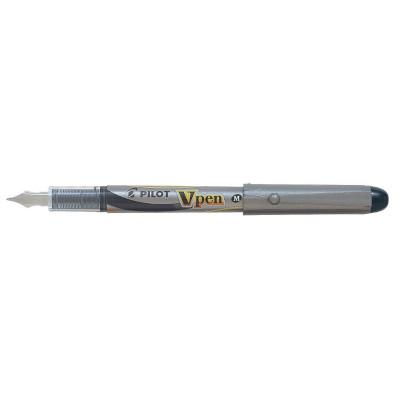 Penna stilografica monouso con pennino in lega e fusto di colore grigio. Il flusso dell'inchiostro è sempre visibile e costante.