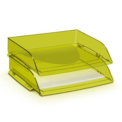 Vaschette portacorrispondenza trasparenti con apertura sul lato lungo,per un più facile e comodo accesso ai documenti,in colori moderni e brillanti, impilabili verticalmente anche in posizione scalare,realizzate in polistirene antiurto riciclabile,coordinabili con gli altri accessori della linea HAPPY.